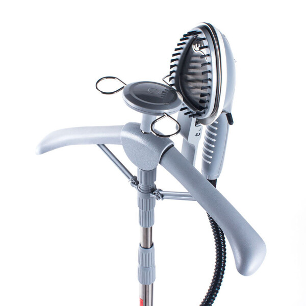 Для нагрева до 110 градусов требуется 2 минуты, а время непрерывной эксплуатации составляет 40 минут. При этом скорость потока пара равна 90 г/мин, а давление достигает 4.5 бар. Оборудование дополнено универсальной насадкой-щеткой и губкой, а также приспособлениями для отпаривания карманов, манжет и воротника.