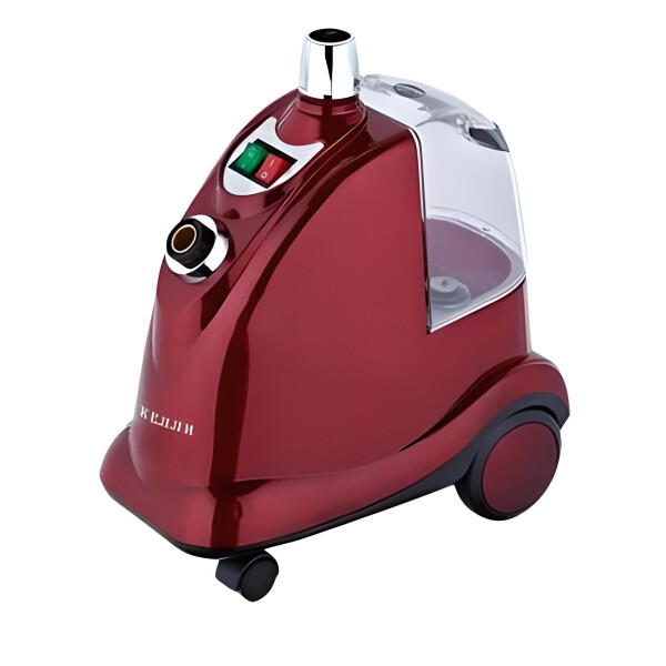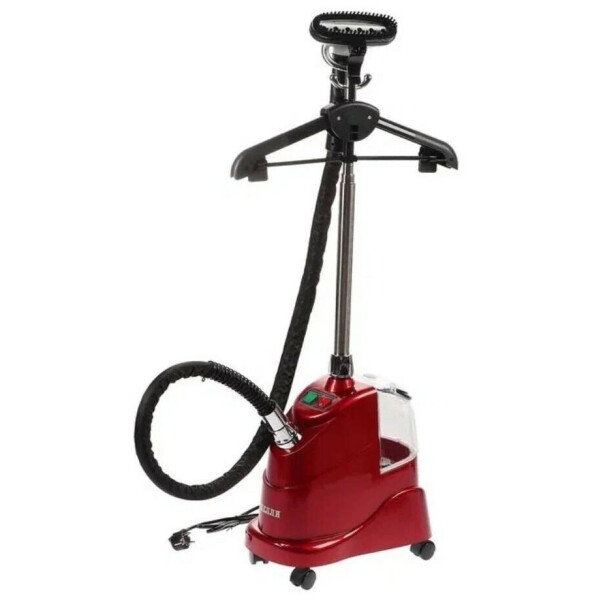 Kelli КL-9 напольный отпариватель в корпусе красного цвета, оборудованный прозрачным резервуаром для воды емкостью 3 л. Конструкция снабжена двумя большими и двумя малыми колесами, что значительно облегчает перемещение. Для размещения одежды используются регулируемая по высоте стойка и вешалка.