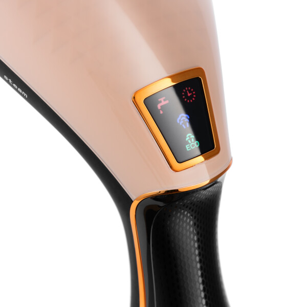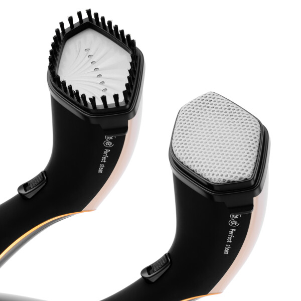 Модель оснащена помпой (водяным насосом). Это позволяет получать пар под давлением выше атмосферного, иметь два уровня подачи пара для ткани разной плотности, отпаривать не только вертикально, но и горизонтально. В комплект входят две насадки для отпаривателя - тканевая и ворсовая. Для очистки одежды от загрязнений прикрепите к отпаривателю ворсовую щетку. Щёткой удобно чистить одежду от шерсти домашних животных. Ею же можно чистить мягкую мебель. На цифровом дисплее отпаривателя есть индикаторы отсутствия воды, интенсивности пара и индикатор режима ожидания.