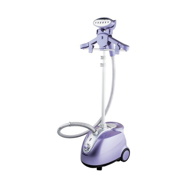 Напольная конструкция отпаривателя предусматривает удобные плечики для вещей, длинным шлангом и большим резервуаром для воды.