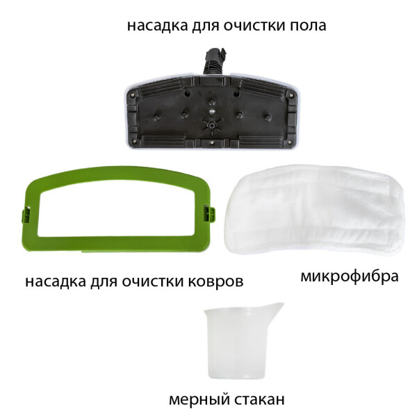 Мерный стакан облегчает наполнение бака водой. В комплекте с пароочистителем поставляются насадка для напольных покрытий, накладка для чистки ковровых покрытий и салфетка из микрофибры.