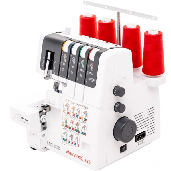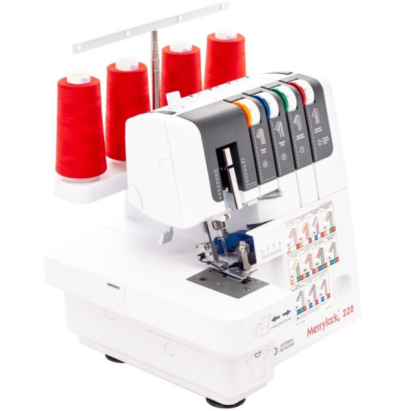 Merrylock 220 - это простой и удобный современный оверлок 2019 года, рассчитанный для домашнего использования и гарантирующий отличное качество шитья, равно как легких, так и плотных материалов, от шелка до джинсы. Эта машина предназначена для выполнения различных видов строчки в соответствии с комбинированием различных положений игл, способов заправки нитей, установленного значения натяжения и использования конвертера для верхнего петлителя.