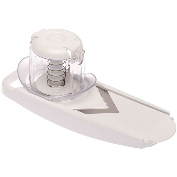 В нижней части устройства находится регулятор толщины. Выставите его по своим предпочтениям, положите продукт в контейнер с безопасным держателем и двигайте последний в направлении V-образного ножа, пока не срежется первый ломтик. Далее отодвиньте контейнер на исходную позицию и повторяйте действия.