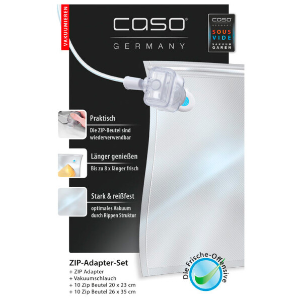 Специальные прочные пакеты с адаптером Caso VC ZIP Adapter Set для вакуумного упаковщика с ZIP-замком. Ребристая внутренняя поверхность служит для оптимального вакуумирования. Высокая прочность пакета допускает замораживание, использование в СВЧ печи, готовку по технологии Sous-Vide. Caso VC ZIP Adapter Set защищают продукты от морозного ожога и предназначены для многоразового использования.