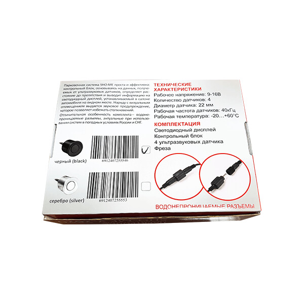 Парковочная система на 4 датчика Sho-Me Y-2620 black, дисплей устанавливается в задней части автомобиля. Визуальное и звуковое оповещение о препятствиях. На дисплее высвечивается аналоговая шкала, позволяющая оценить скорость сближения, борт (правый или левый), со стороны которого зафиксировано препятствие, а также цифровая шкала с расстоянием до него.
