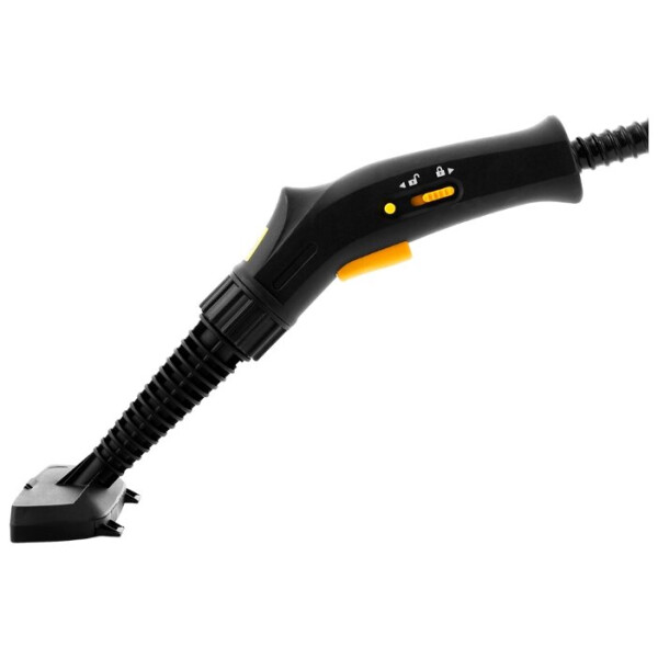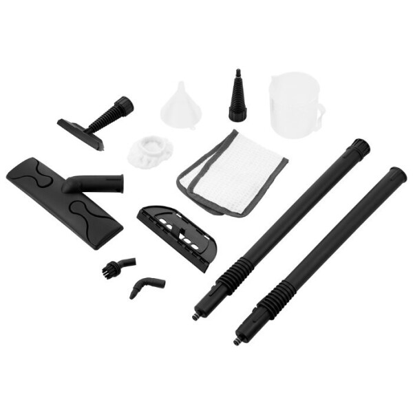 В комплекте с пароочистителем, помимо щётки для пола с тряпкой, идут различные насадки: струйная насадка, насадка для отпаривания со специальной тряпкой, круглая нейлоновая щётка для особо стойких загрязнений и другие. Выключатель питания располагается на корпусе пароочистителя. Кнопка подачи пара находится на паровом пистолете. На боковой панели пистолета имеется специальный блокиратор от случайного нажатия. В случае возникновения в бойлере избыточного давления предохранительный клапан, встроенный в крышку бойлера, стравит пар, пока давление не опустится до безопасного уровня.