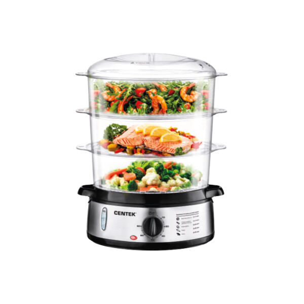 Пароварка Centek CT-1457 объемом 9 литров имеет 3 контейнера для приготовления на пару. Корпус модели выполнен из высококачественных стальных материалов, мощность составляет 800 Вт.