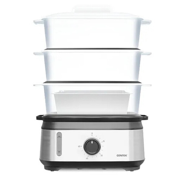 Пароварка Centek CT-1458 мощностью 1050 Вт станет настоящей находкой для поклонников правильного питания или для молодых мам, которые готовят полезный прикорм ребенку. Конструкция устройства состоит из 3 ярусов, а емкость вмещает до 9 л пищи. Каждое из отделений вмещает до 3 л. Корпус прибора изготовлен из нержавеющей стали, а паровые корзины - из пластика. Модель имеет механическое управление и съемные решетки. Характеристики; Мощность - 1050 Вт. Общий объем - 9 л. Таймер - 60 мин. 3 чаши для приготовления. Быстрое парообразование. Резервуар для воды - 1.5 л. Индикатор работы. Окно уровня воды. Чаша рисоварка. Стальной корпус.