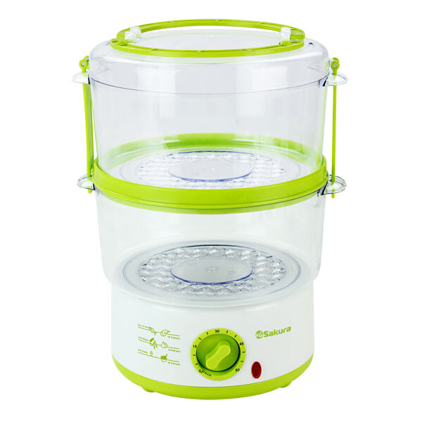 С пароваркой Sakura SA-7213GR вы сможете готовить одновременно несколько блюд, используя две большие паровые камеры для овощей или мяса. Этот простой и доступный по цене прибор значительно упрощает процесс приготовления пищи на пару. Вам необходимо просто поместить продукты в паровые камеры, и пароварка приготовит все сама. Объем пароварки составляет 5 литров. Во время приготовления Вы сможете доливать воду. При отсутствии в пароварке воды она отключается автоматически. Если вы решили перейти на здоровое питание, то Вам совершенно необходима современная пароварка Sakura SA-7213GR.