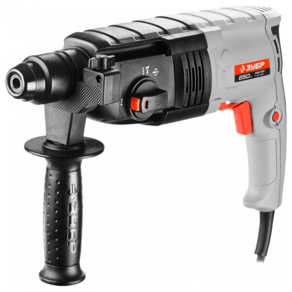 Перфоратор Зубр П-22-650 предназначен для сверления и долбления бетона, кирпича и прочих строительных материалов, отличающихся повышенной прочностью. Перфоратору доступны 3 режима работы: сверление, долбление, сверление с ударом. Максимальная энергия удара составляет 2.3 Дж, количество ударов, которое способен «выдавать» перфоратор в минуту, приравнивается к 4850, а число оборотов холостого хода может достигать 870 в минуту. В сочетании с одной рабочей скоростью этих солидных показателей довольно для выполнения большинства ремонтных работ с использованием перфоратора.