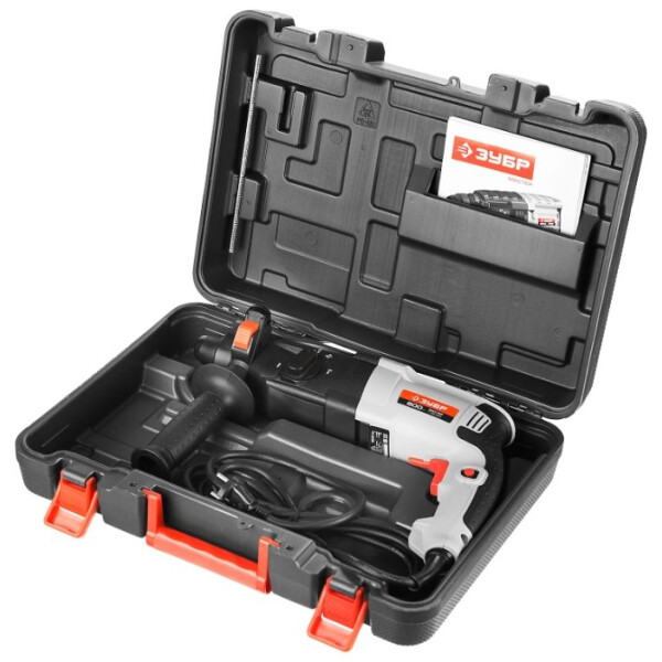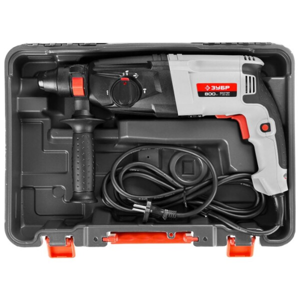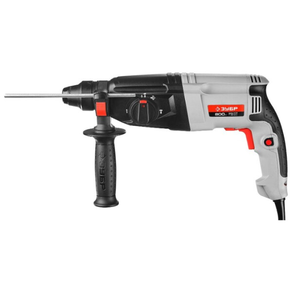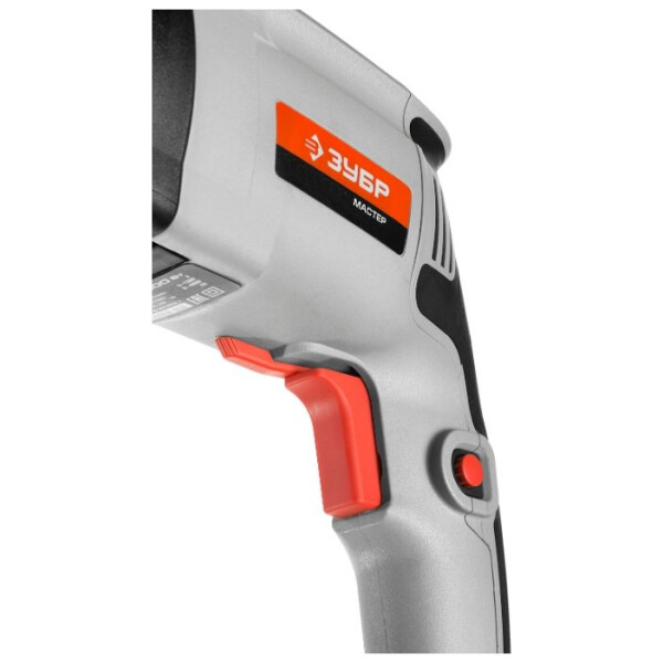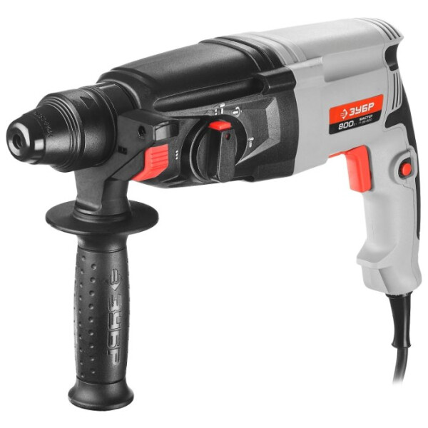 Перфоратор ЗУБР МАСТЕР П-26-800 имеет три режима работы: сверление, сверление с ударом и долбление. Также предусмотрен режим поворота долота - на определённый градус после каждого удара. Переключение между ними осуществляется с помощью тумблера сбоку на корпусе. Для удобства продолжительной по времени работы имеется фиксатор клавиши "Пуск", что исключает необходимость постоянно держать на ней палец.