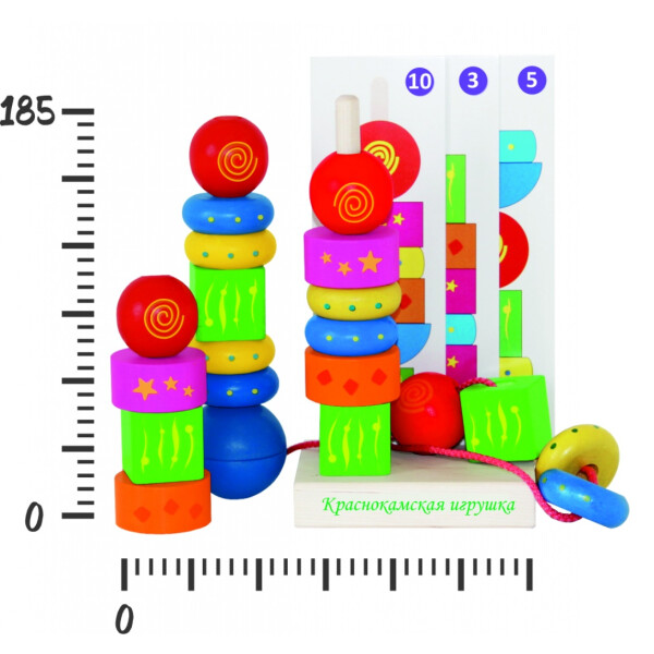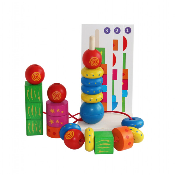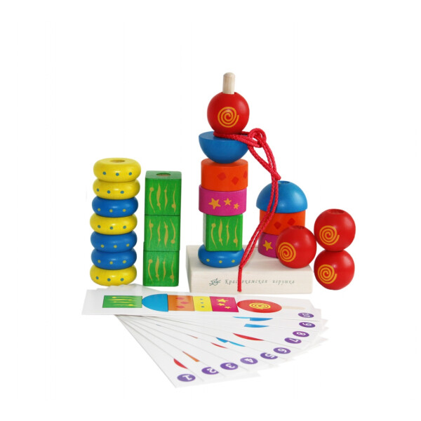 Карточки с заданиями помогут сделать игру еще более интересной и увлекательной. Также в набор входит шнурок, на который можно нанизывать разноцветные фигурки. Все элементы набора изготовлены из натурального дерева и окрашены акриловой краской, благодаря чему являются абсолютно безопасными для детей.