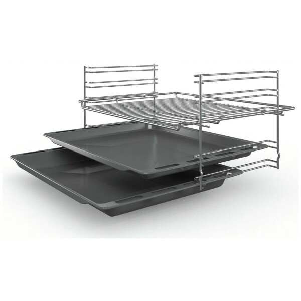 В комплекте есть два противня для выпечки (глубокий и плоский), а также металлическая решетка для духовки. Модель оснащена регулируемыми по высоте ножками.