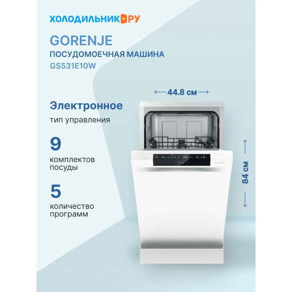 Модель Gorenje GS531E10W может похвастаться встроенным дисплеем, который значительно облегчит процесс выбора необходимых параметров ее работы. В приборе реализовано 5 различных программ, позволяющих быстро и эффективно очистить посуду из различных материалов, снизив расход электричества и воды. Корзина для посуды регулируется по высоте, исходя из вашего роста. Об окончании цикла стирки вас оповестит характерный звуковой сигнал.