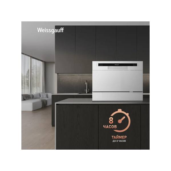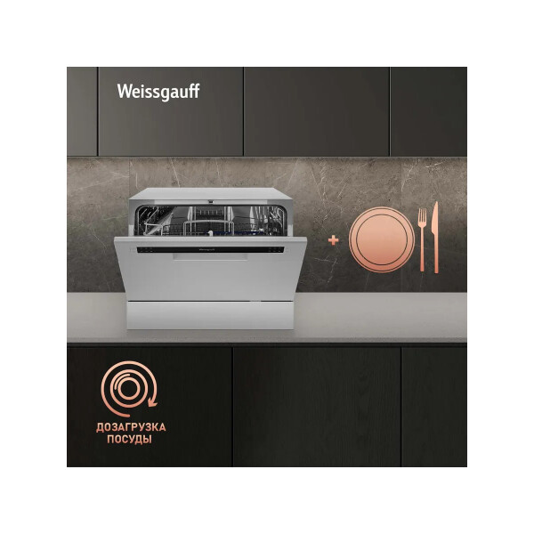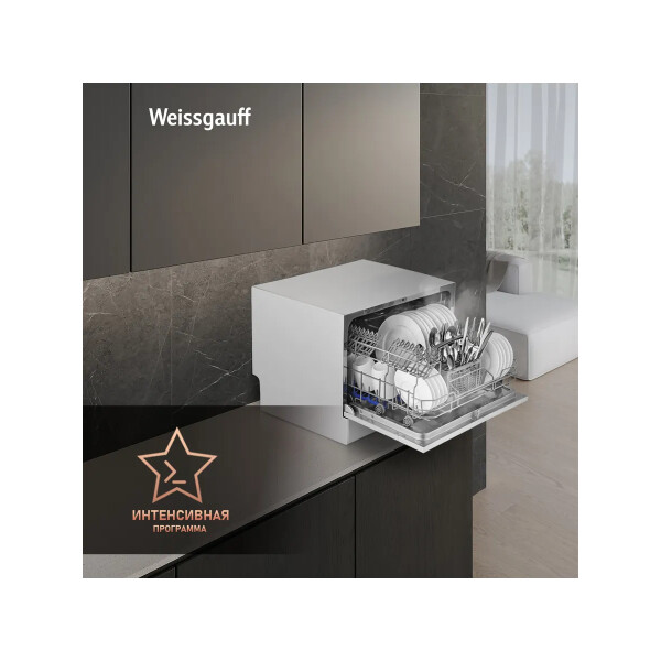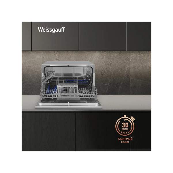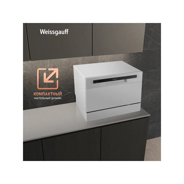 Благодаря тому, что ассортимент моделей Weissgauf непрерывно развивается, в нём появляются новые удобные и эргономичные модели. В этот раз производитель позаботился о том, чтобы вы могли установить эту компактную посудомоечную машину прямо на кухонный стол. Это не только сэкономит место на вашей кухне, но и откроет новые возможностей по организации рабочего пространства на ней.
