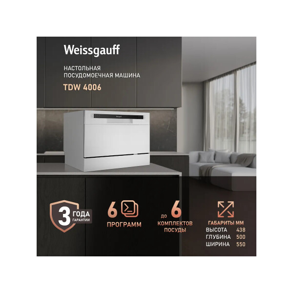 Настольная посудомоечная машина Weissgauff с полностью электронным управлением, набором из 6 программ и вместимостью на 6 комплектов посуды - это по-настоящему незаменимая кухонная помощница прямо у вас на столе.