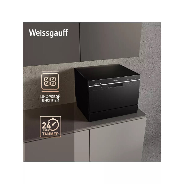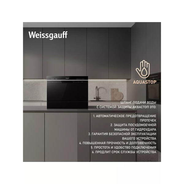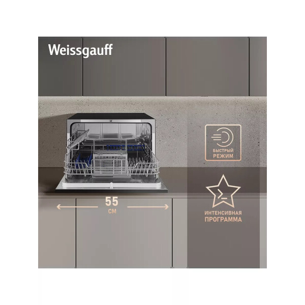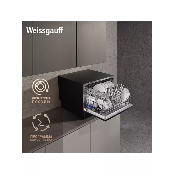 Благодаря тому, что ассортимент моделей Weissgauff непрерывно развивается, в нём появляются новые удобные и эргономичные модели. В этот раз они позаботились о том, чтобы вы могли установить эту компактную посудомоечную машину прямо на кухонный стол. Это не только сэкономит место на вашей кухне, но и откроет новые возможностей по организации рабочего пространства на ней.
