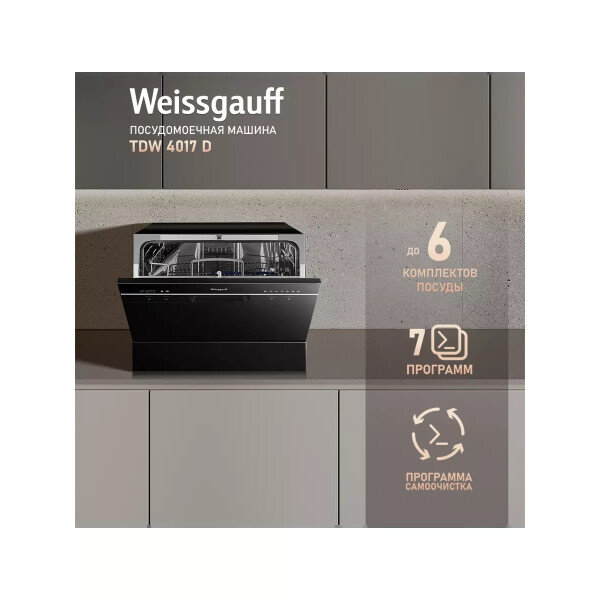 Настольная посудомоечная машина Weissgauff с функцией самоочистки, полностью электронным управлением и богатым набором из 7 программ - это модель, которая отличается не только компактностью, но и высокой и функциональностью.