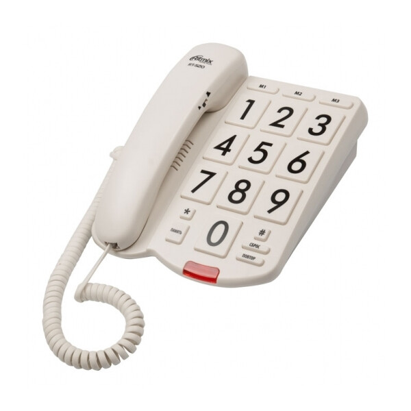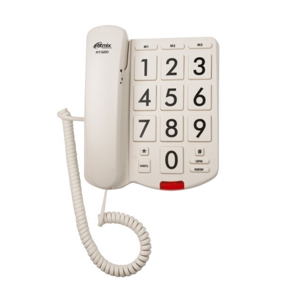 Ritmix RT-520 – это проводной телефонный аппарат с крупными кнопками, который идеально подойдет для слабовидящих людей. Световой индикатор звонка и регулировка его громкости помогут не пропустить вызов, а регулировка громкости в трубке будет полезна для тех, кто испытывает трудности со слухом. Три экстренных номера однокнопочного набора без труда сохраняются в память телефона.