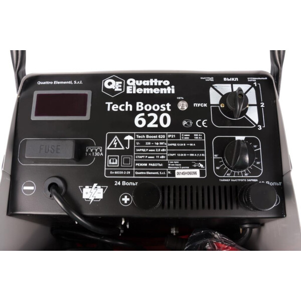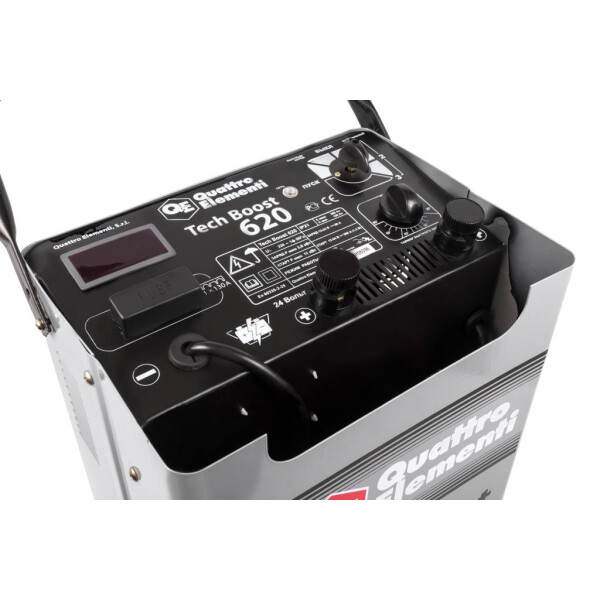 Со временем автомобильный аккумулятор теряет часть своего заряда. Результатом этого процесса часто является невозможность завести двигатель. Компания QUATTRO ELEMENTI предложила отличный выход, создав пуско-зарядное устройство QUATTRO ELEMENTI TechBoost 620. Способность этого агрегата оживить автомобиль просто поразительна. Для запуска мотора применяется пусковой заряд до 620 А, а номинальное его значение – 590 А. Кроме этого, данное устройство предназначено для качественной автоматической зарядки аккумулятора. Оно просто подключается к бытовой электросети и начинает работать. Зарядный ток может достигать 90 А. И зарядка может проходить в двух режимах: с напряжением 12 В или 24 В. Внешне пуско-зарядное устройство QUATTRO ELEMENTI TechBoost 620 имеет привлекательный современный вид. Для удобства его перемещения предусмотрены маневренные колеса.