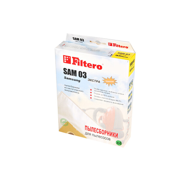 Мешки-пылесборники Filtero SAM 03 ЭКСТРА Anti-Allergen, 4 штуки. Пылесборники Filtero ЭКСТРА Anti-Allergen произведены из синтетического микроволокна MicroFib с антибактериальной пропиткой Anti-Bac. Очень прочные, они не боятся острых предметов и влаги, собирают больше пыли (до 50%) и обеспечивают уровень очистки воздуха 99,9%, а также задерживают бактерии и препятствуют их распространению. При этом мощность всасывания пылесоса сохраняется в течение всего периода службы пылесборника.