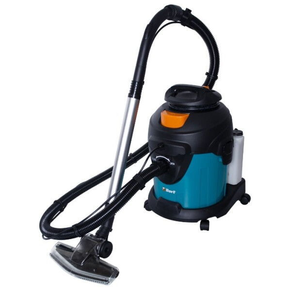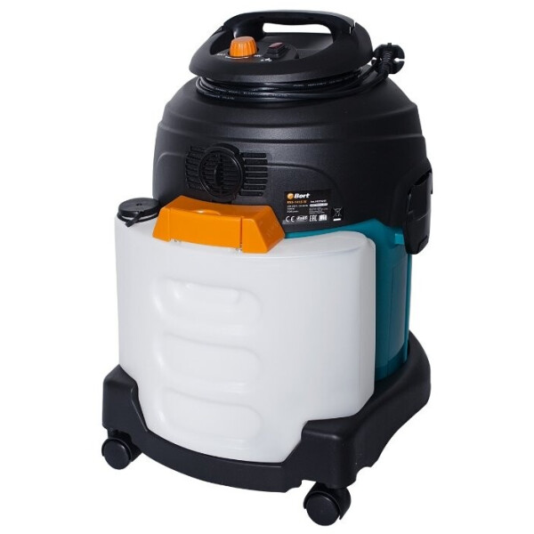 Bort BSS-1415-W – это моющий пылесос, поэтому он предусматривает наличие емкости для воды. Контейнер пылесоса рассчитан на 15 л, поэтому вам не придется заботиться об очистке пылесборника, даже если вы имеете дело с очень загрязненным помещением. Вес прибора составляет 7.6 кг, поэтому для легкости его перемещения корпус предусматривает наличие колесиков. Для легкости включения кнопка на корпусе расположена таким образом, чтобы вы могли включить прибор нажатием ногой.