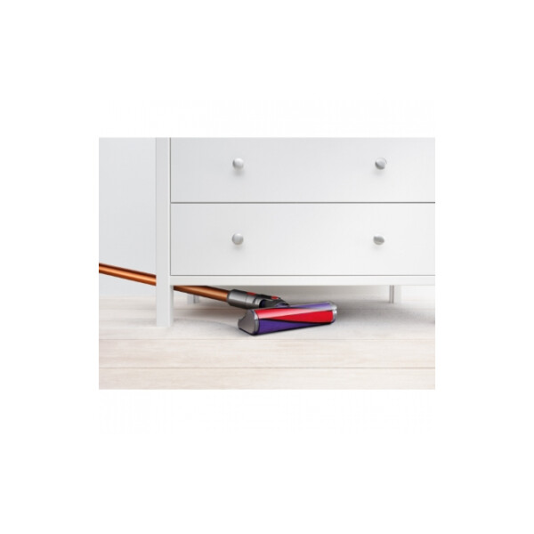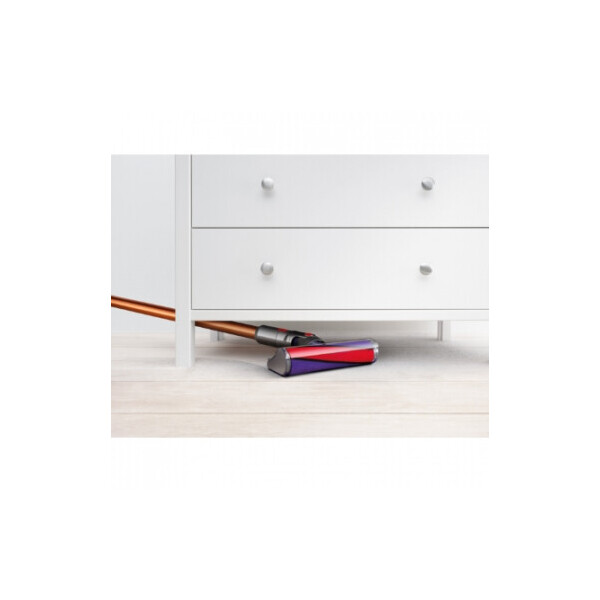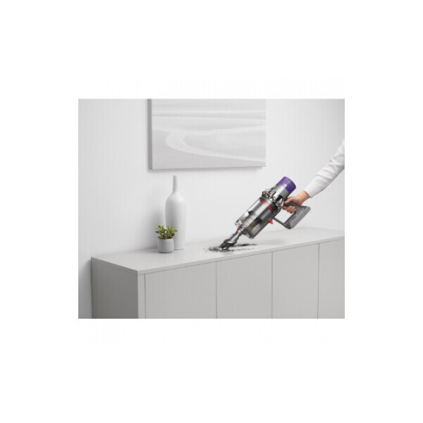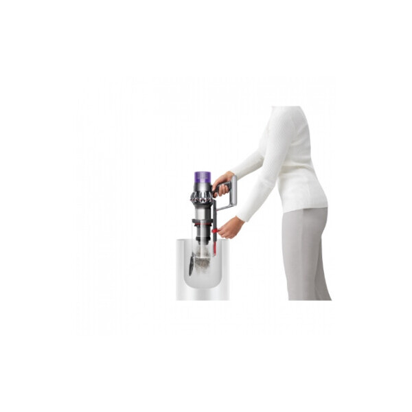 Новая улучшенная система гигиеничной очистки контейнера. В удлиненном узком контейнере используется усовершенствованная система очистки. Пыль и грязь выталкивается из контейнера одним движением - не приходится контактировать с мусором. Двигатель пылесоса Dyson Cyclone V10 размещен над рукояткой, поэтому центр тяжести находится близко к руке, что облегчает уборку высоко расположенных поверхностей и труднодоступных мест.