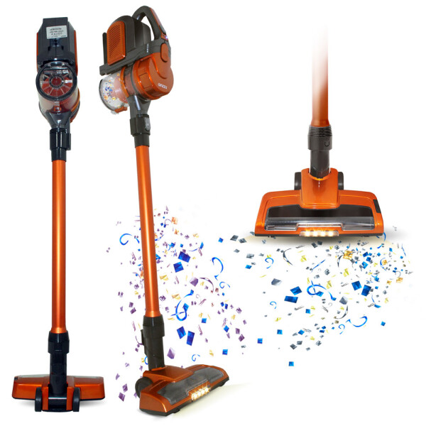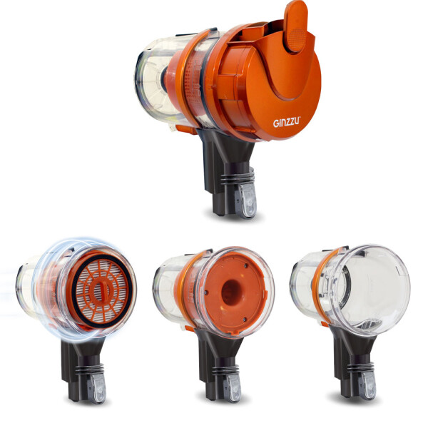 Пылесос GINZZU VS402 оборудован 500-миллилитровым пылесборником, роль которого играет циклонный фильтр. Этот тип пылесборника традиционно отличается простотой очистки. В комплектацию пылесоса входит турбощетка с подсветкой. Бытовой прибор очень удобно хранить: пылесос имеет настенное крепление. Вы сможете сэкономить полезное пространство. Важной отличительной особенностью модели является низкий уровень шума: он равен лишь 68 дБ. Пылесос имеет стильный оранжевый цвет. Модель упакована в коробку, имеющую привлекательный внешний вид.
