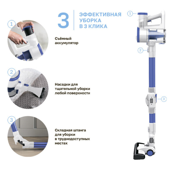 Оптимальное соотношение параметров и стоимости. Мощная моторизированная щетка 7800 об/мин с LED подсветкой. Производит глубокую очистку любых поверхностей. Удобная складная штанга ClickStick раскладывается в один клик, позволяя вам производить эффективную уборку в труднодоступных местах и под мебелью. Сгибается только штанга вы сохраняете комфортное положение тела. Два режима работы: Eco режим до 60 минут без подзарядки, Turbo режим до 25 минут. Сила всасывания 8 000 и 15 000 Пa соответственно. Моющийся контейнер для сбора пыли с откидной крышкой для быстрой гигиеничной очистки. Сменный HEPA-фильтр с уровнем фильтрации 99,9%. Съемный аккумулятор для удобства зарядки.