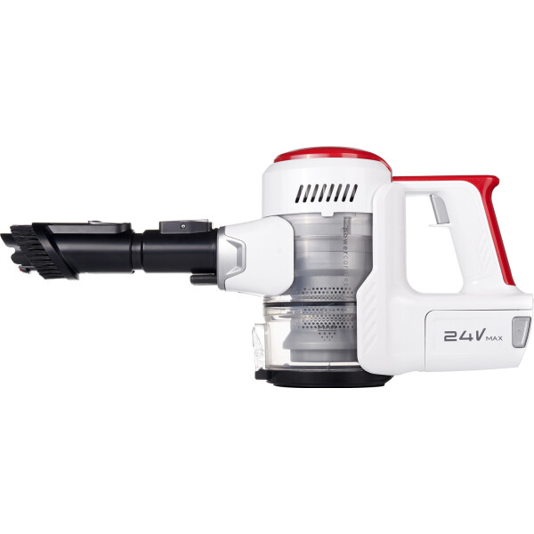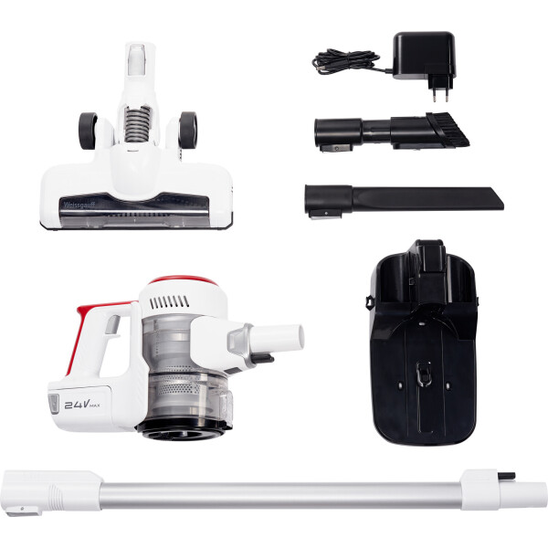 Богатая комплектация устройства включает в себя основной блок с двигателем, зарядное устройство, электрическую щетку, съемную рукоятку, настенное крепление, насадку для ухода за мебелью и занавесками, а также насадку для уборки труднодоступных мест!