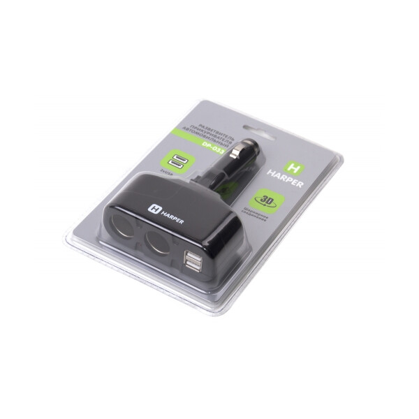 Разветвитель автоприкуривателя Harper DP-033 заключен в черный пластиковый корпус и защищен от короткого замыкания. Представленный прибор имеет 2 разъема прикуривателя и 2 USB-разъема. Это позволяет использовать разветвитель одновременно с 4 приборами с соответствующими портами. Это могут быть смартфоны или планшеты. При этом входное напряжение составляет 12/24 В. Ток по USB пускается силой до 1 А.