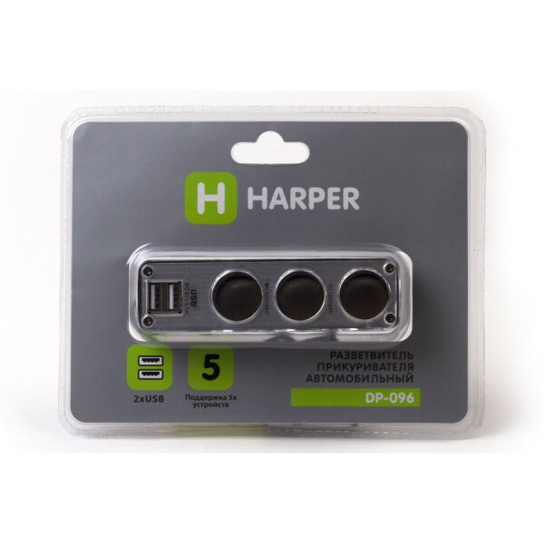 Преимуществом разветвителя Harper DP-096 является наличие 2 портов USB, которые необходимы для зарядки аккумуляторов мобильных устройств: планшетов, смартфонов, мобильных телефонов, навигаторов, видеорегистраторов и другой техники. Обеспечивается выходной ток, который может достигать 2 А. Удобству использования устройства способствует световой индикатор питания. Длина кабеля разветвителя равна 60 см: этот показатель обеспечивает возможность установки разветвителя в удобном для вас месте. Производителем обеспечена защита разветвителя от короткого замыкания. Передняя панель устройства имеет стильный серебристый цвет. Преобладающим же цветом в дизайне разветвителя является классический черный.