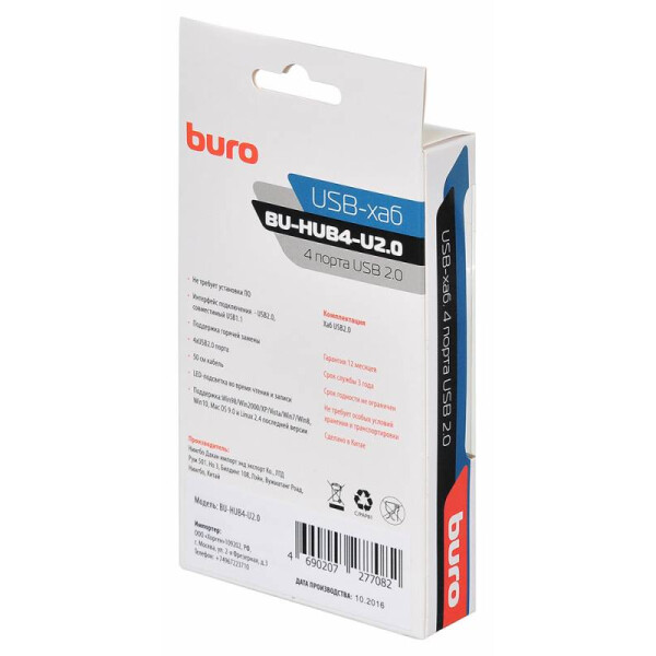 Разветвитель Buro BU-HUB4-U2.0 черного цвета с интерфейсом USB 2.0 имеет следующие особенности: