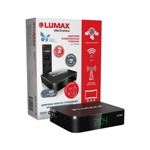 К Lumax DV2104HD можно подключить Wi-Fi-адаптер и таким образом получить выход в Интернет со всеми его возможностями. Бонусом к приставке идет доступ к 100 хитам российского и советского кинематографа. Трансляция передач возможна в форматах HD и FullHD.