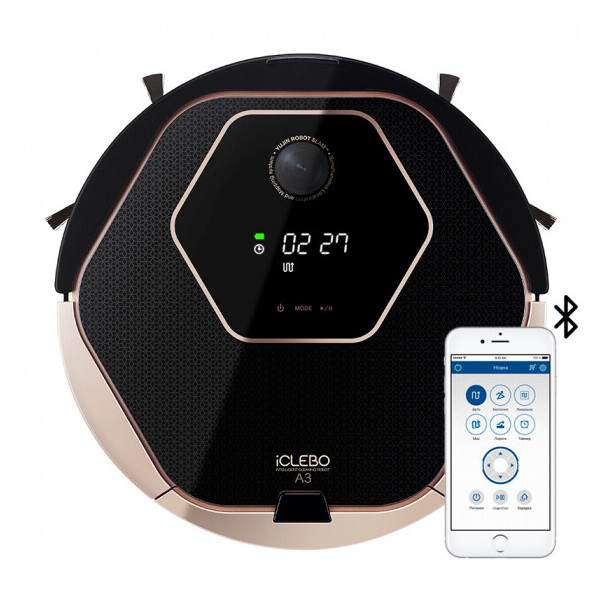 iCLEBO A3 новый умный робот-пылесос с технологией построения карты помещения, Bluetooth приложением для смартфона, звуковым сопровождением, функцией влажной уборки и непревзойденным корейским качеством и надежностью. Подойдет для уборки на гладких полах в больших помещениях площадью до 220 кв. метров. Имеет низкий уровень шума и разные режимы для достижения максимального качества уборки. iCLEBO A3 имеет приложение для смартфона для управления перемещением робота, гибкой настройки расписания уборки и активации голосовых команд. На главном экране приложения доступны выборы режимов, возможность установки таймера на разные дни недели, пульт управления пылесосом. Среди дополнительных функций приложения: возможность активации и деактивации голосового сопровождения работы и ошибок, а также удобный доступ к магазину аксессуаров и поддержке. Для использования приложения достаточно его скачать из Play.Google или AppStore и настроить соединение с роботом через протокол Bluetooth.