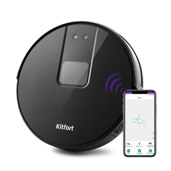 Робот-пылесос Kitfort КТ-572 принадлежит к новой серии роботов-пылесосов. Он вобрал в себя все современные наработки в этой области: датчики препятствий и поверхности, увеличенный объём пылесборника, литиевый аккумулятор, НЕРА-фильтр, простоту управления. Мобильное приложение Robot Cleaner предназначено для управления роботом-пылесосом КТ-572 со смартфона по сети Wi-Fi. Находясь вне дома, вы можете дистанционно запустить пылесос, поменять режим, посмотреть карту уборки помещения. Во время работы пылесос рисует карту помещения и отображает её в мобильном приложении, чтобы не убирать повторно одни и те же места. Навигация осуществляется с помощью камеры. По завершении уборки карта сбрасывается и в следующий раз рисуется заново. Через мобильное приложение Robot Cleaner с помощью видеокамеры, установленной в корпусе робота-пылесоса, вы можете проверять обстановку дома, находясь в отпуске или командировке. При желании можно сохранять фото или видео в память телефона. С помощью мобильного приложения вы можете установить уборку по часам в любые дни недели, настроив также режим уборки и мощность работы. Принцип работы установки расписания в точности такой же, как установка будильника на вашем телефоне. Пылесос оснащён функциями автоматической и ручной уборки, а также уборки по спирали. В последнем режиме пылесос начинает убираться по кругу из той точки, где он находился, постепенно увеличивая диаметр уборки. Турбощётка отлично убирает ковры, сначала приподнимая ворс, выметая из него мусор и затем засасывая его. На твёрдой поверхности турбощётка работает как веник. Боковые щётки выступают за габариты пылесоса, что позволяет собирать пыль вдоль плинтусов. Вы можете провести влажную уборку, прикрепив к пылесосу моющий модуль с резервуаром для воды и тряпкой, которая автоматически увлажняется во время работы. Робот сначала засасывает пыль и мусор в пылесборник, а затем увлажняет пол тряпкой. Благодаря оптическим датчикам, которые срабатывают на вертикальные препятствия и при столкновении с ними, и микропереключателям, пылесос меняет направление движения и продолжает уборку. Датчики поверхности не дают упасть с больших перепадов высоты.Благодаря оптическим датчикам, которые срабатывают на вертикальные препятствия и при столкновении с ними, и микропереключателям, пылесос меняет направление движения и продолжает уборку. Датчики поверхности не дают упасть с больших перепадов высоты.