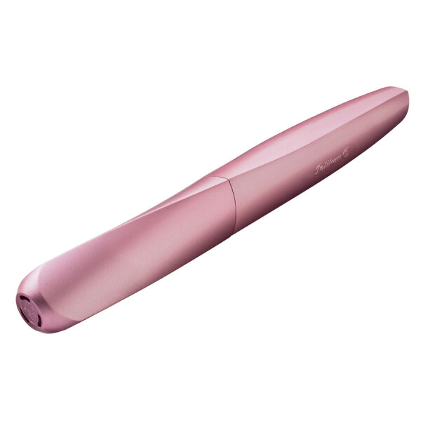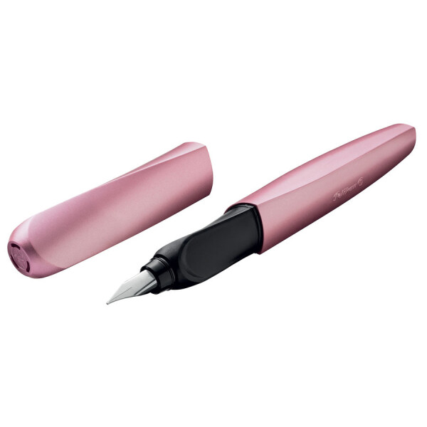 Перьевая ручка Pelikan Twist со стальным пером M. Нежный розовый корпус ручки трехгранной формы, чуть закручен по часовой стрелке. Эргономичная трехгранная секция из черного пластика. Большой колпачок без клипа. Материал пера - сталь нержавеющая.