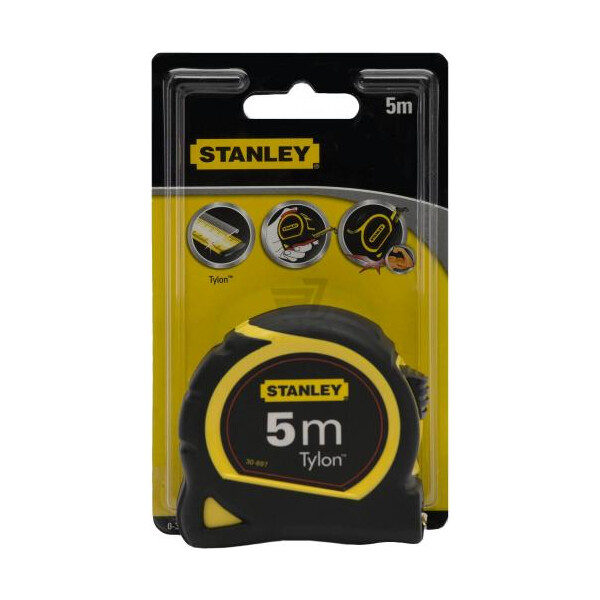 На корпусе измерительной рулетки Tylon 5 м Stanley 0-30-697 предусмотрены мягкие вставки из эластомера - для более комфортного удержания приспособления при разметочных, ремонтных работах. Специальное покрытие Tylon мерной ленты способствует ее меньшему износу. Фиксатор на корпусе необходим для торможения ленты в нужном положении. Благодаря зажиму рулетку можно закрепить на поясном ремне.