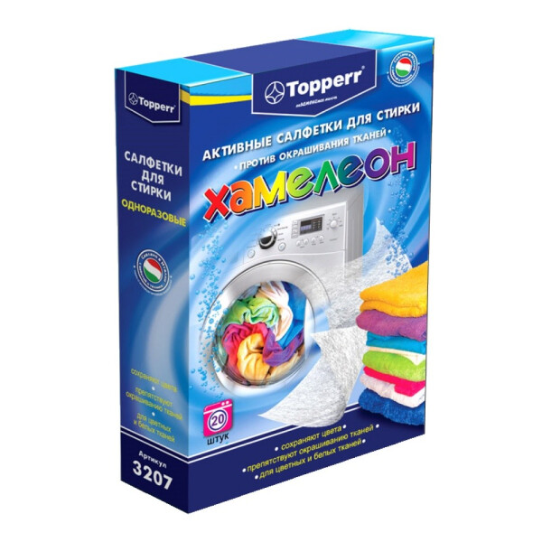 Активные салфетки для стирки Topperr 3207 уберегут ваши вещи от постороннего окрашивания. Теперь можно не волноваться за сохранность красок вашего белья. С Topperr 3207 вам больше не придется сортировать белье по цветам и вручную стирать вещи, которые имеют свойство линять. Просто положите одну салфетку на дно барабана при неполной его загрузке. Если же вы планируете загрузить машинку полностью, используйте пару салфеток. Далее стирайте в обычном режиме с применением привычных моющих средств.