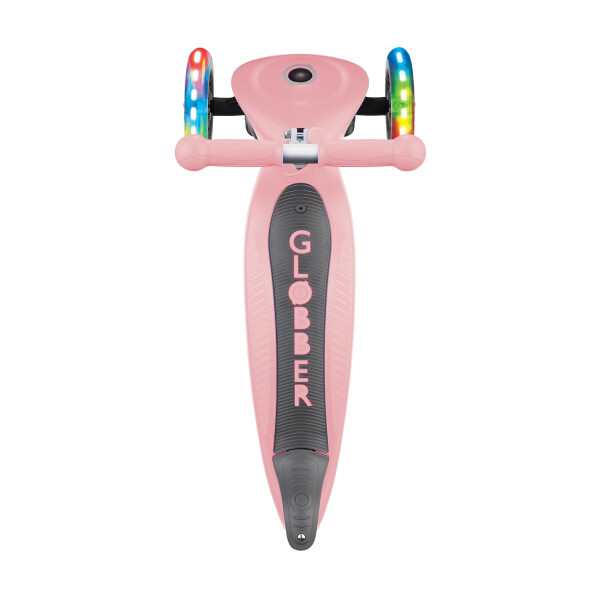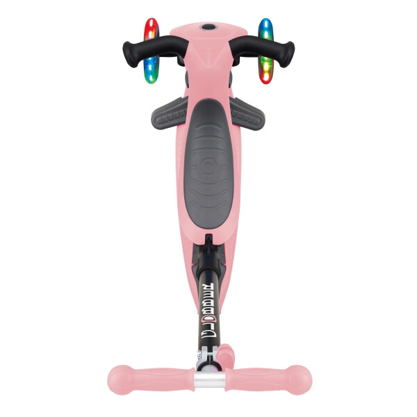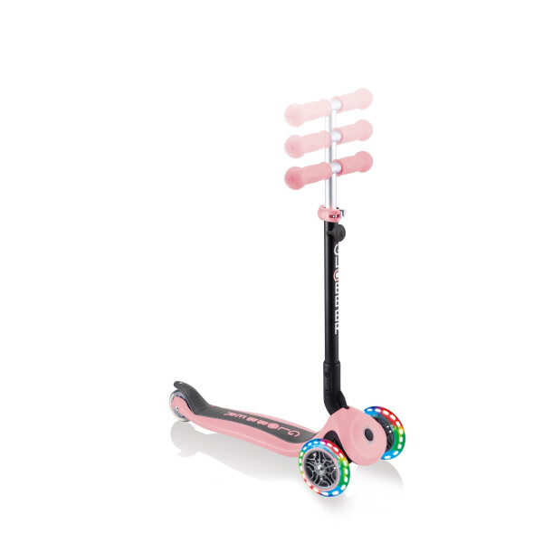 Globber Go Up Foldable Lights стильный и практичный безвинтовой трансформер, который без дополнительных инструментов может превратиться в 3 разных средства передвижения: каталку, беговел и самокат. Мягкое сидение регулируется по высоте для максимального комфорта. Удлиненный и широкий задний тормоз обеспечивает эффективность торможения и продлевает срок службы колес. Есть длинная и широкая съемная подставка для ног с легко откручиваемой ручкой. Запатентованная кнопка блокировки рулевого управления фиксирует рулевую систему двух передних колес только для движения вперед и назад, чтобы ребенок не упал. Передние литые колеса оснащены двумя безбатарейными светодиодными фонарями, которые мигают красным, синим и зеленым цветами. Конструкция в виде каталки или беговела рассчитана для детей от 15-ти месяцев до 3-х лет весом до 20 кг. Самокат с Т-образной рулевой стойкой, регулируемой по высоте, и эргономичными ручками подходит для детей 3-7 лет до 50 кг.