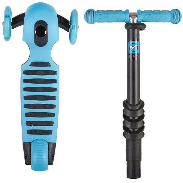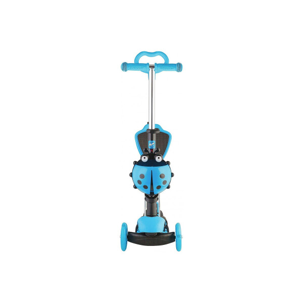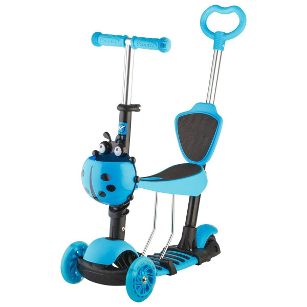 Самокат-трансформер вместо обычного руля управляется ручкой, которая работает по принципу джойстика. Платформа кикборда тоже имеет функцию управления ездой с помощью ног, как у скейта. На руле кикборда есть корзинка для перевозки вещей, сделанная в виде симпатичной божьей коровки. Самокат голубого цвета понравится детям. Высота руля кикборда регулируется. Самокат оснащен ножным тормозом.