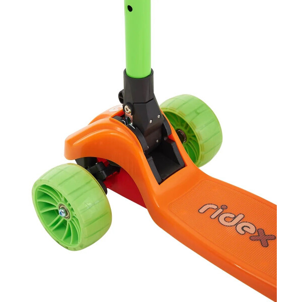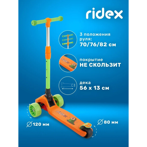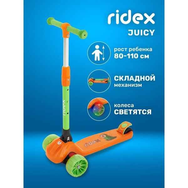 Трехколесный самокат Juicy от бренда RIDEX совмещает в себе все эти качества. Сочные цвета, забавный дизайн шкурки и светящиеся передние колеса это лишь малая часть того, за что ребенок полюбит этот самокат. Высокопрочная дека из полипропилена отвечает за надёжность самоката, а цепкая шкурка не даст соскользнуть ножке малыша. Колеса из полиуретана сделают катание еще более комфортным, уменьшая тряску на неровном дорожном покрытии. Шустрые подшипники АВЕС-7 обеспечат отличный накат и помогут поддержать заданную ребенком скорость.