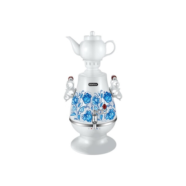 Самовар Centek СТ-0091 А привлекает внимание белоснежным корпусом с нежными голубыми узорами. Основной бак вмещает 4 л воды, а заварник 1 л. Прибор действует с мощностью 2100 Вт, обеспечивающей быстрое кипячение. Простой очистке от накипи способствует наличие скрытого нагревательного элемента.