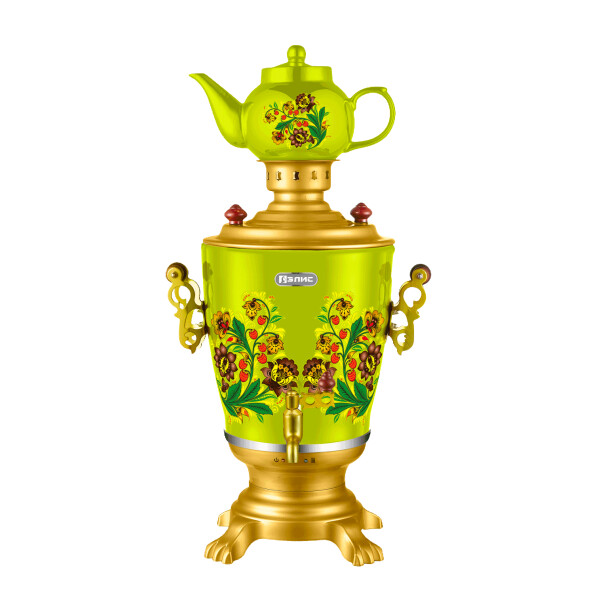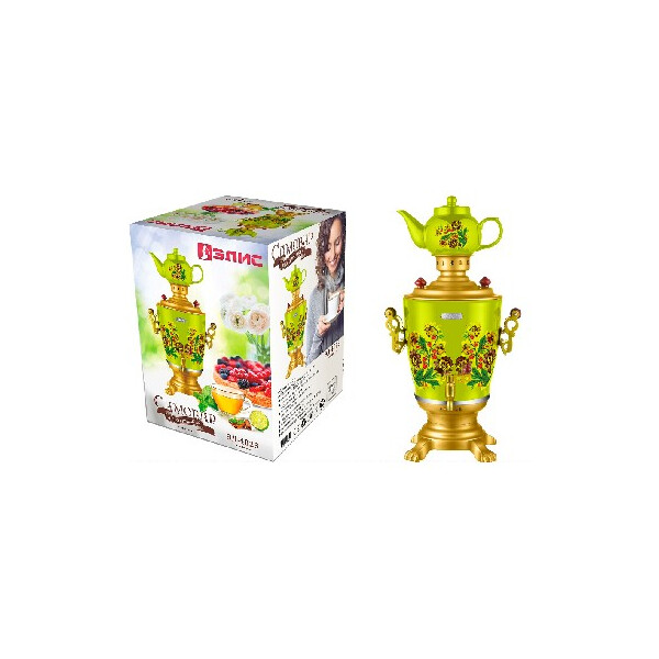 Элис ЭЛ-4023 - электрический самовар выполнен из нержавеющей стали и имеет классическую форму, а его объем 4 л позволит собрать за столом большую компанию. У изделия полированный корпус зеленого цвета с цветочным рисунком, по бокам расположены две пластмассовые ручки, а спереди хромированный кран. Сверху находится заварной чайник зеленого цвета объемом 1 л, выполненный из керамики.