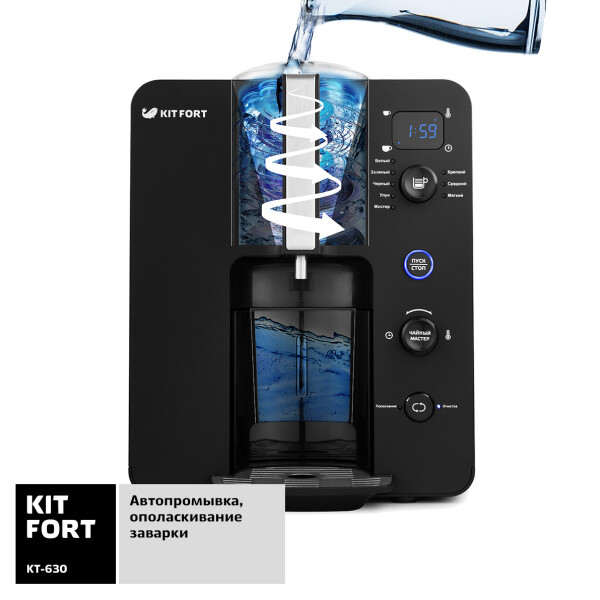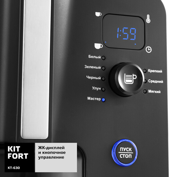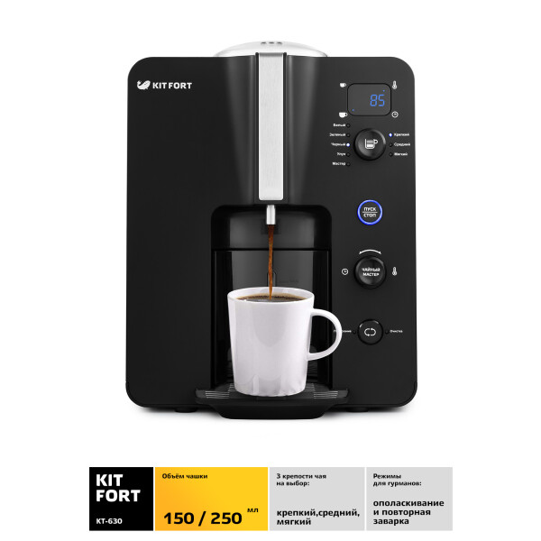 Автоматическая чаеварка Kitfort KT-630 позволяет заварить чай в автоматическом режиме. У чаеварки несколько предустановленных опций традиционного заваривания различных сортов чая: чёрный, зелёный, белый, чай Улун. Доступна опция пользовательской конфигурации заваривания «Чайный Мастер», где можно самостоятельно задать продолжительность и температуру заваривания.