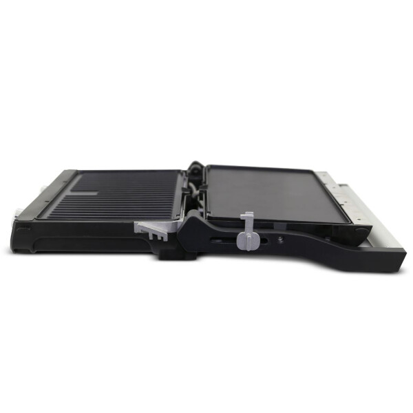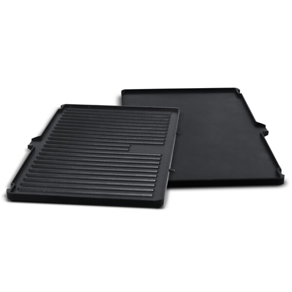 Двусторонние съемные панели с гладкой и рифленой поверхностью для создания полосок гриля. Литые панели толщиной 1,8 мм. Прочное антипригарное покрытие.