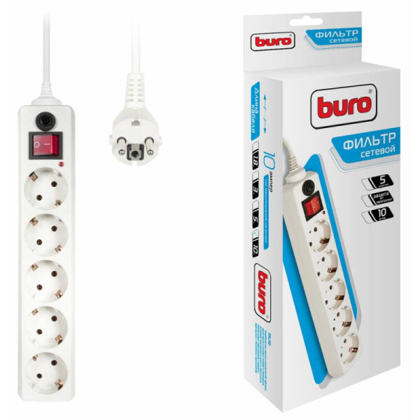 Сетевой фильтр Buro 500SH-10-W подключается к источнику электропитания посредством стандартной евровилки. Прорезиненная оплетка шнура исключает истирание, что увеличивает срок эксплуатации устройства. Корпус модели произведен из высокопрочного поликарбоната и обладает устойчивостью к возгоранию.
