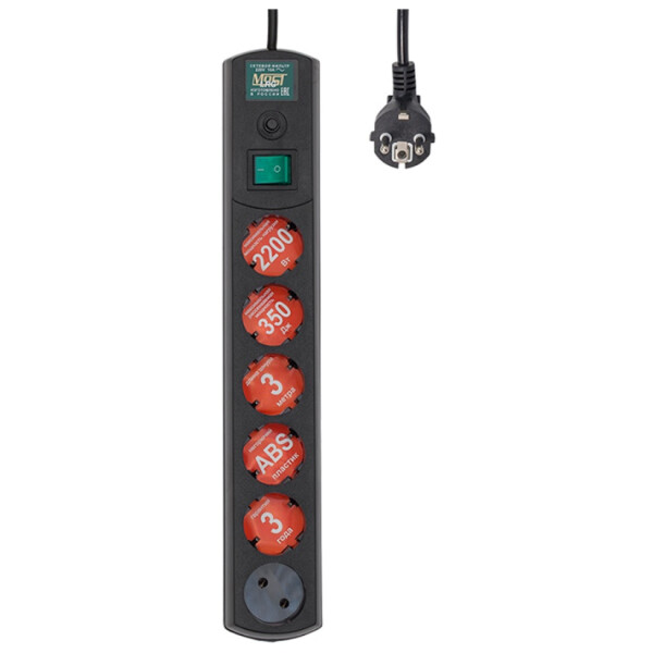 Данная модель оснащена шестью розетками, имеет шнур длиной в 3 метра и надежно защищает подключенные устройства от перепадов напряжения, короткого замыкания и так далее.