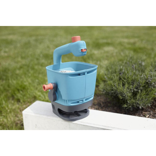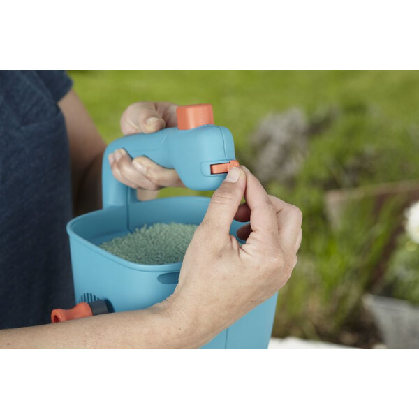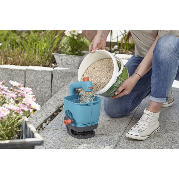 Ручная разбрасыватель-сеялка М идеально подходит для распределения удобрений, семян и технической соли на небольших участках. Расход материала регулируется непосредственно на эргономичной рукоятке. Вращающийся ротор обеспечивает оптимальную функциональность и равномерное разбрасывание материала. Чрезвычайно прочный контейнер изготовлен из высококачественного пластика.