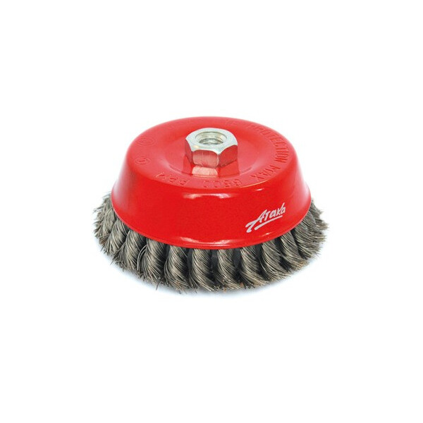 Витая чашеобразная щетка АТАКА 34727 предназначена для обработки различных поверхностей, очистки от различных покрытий, ржавчины и загрязнений. Материал - витая сталь.